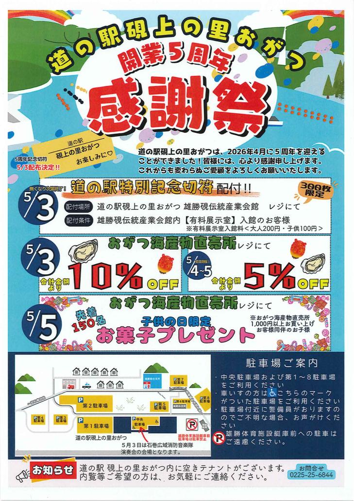 皆様のおかげで道の駅硯上の里おがつは今年で5周年を迎えました。日頃の感謝を込めて3日間にわたる感謝祭を開催いたします。